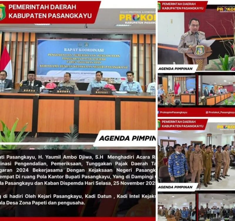 Bupati Pasangkayu, H. Yaumil Ambo Djiwa, S.H., menghadiri Rapat Koordinasi Pengendalian, Pemeriksaan, dan Tunggakan Pajak Daerah Tahun Anggaran 2024 yang bekerja sama dengan Kejaksaan Negeri Pasangkayu, Selasa, 25 November 2025. Kegiatan ini berlangsung di Ruang Pola Kantor Bupati Pasangkayu.