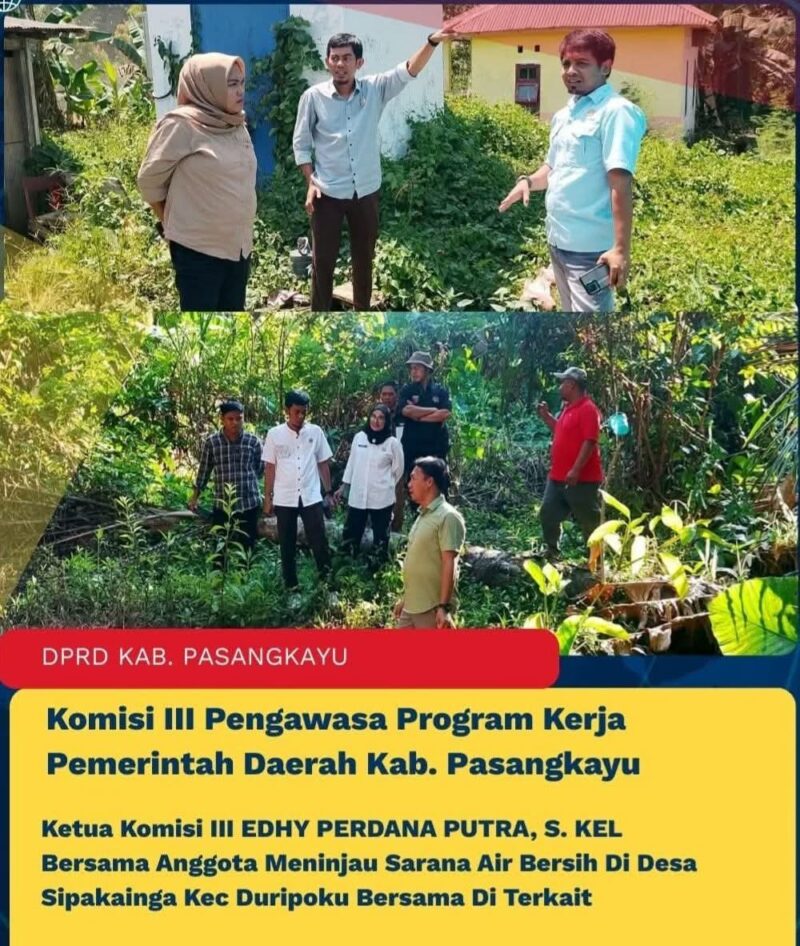 PASANGKAYU, CYBERMERAHPUTIH.CO.ID — Dalam rangka pengawasan Program Kerja Pemerintah Daerah Kabupaten Pasangkayu, Tim Komisi III DPRD Pasangkayu melakukan peninjauan sarana air bersih di Desa Sipakainga, Kecamatan Duripoku.