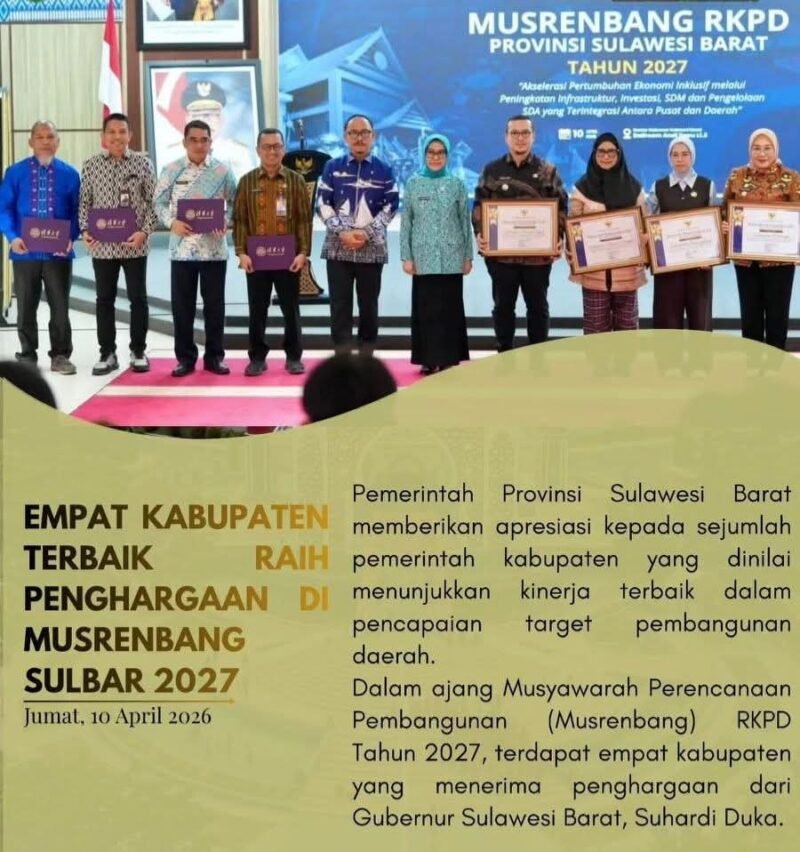 Penghargaan tersebut diserahkan dalam ajang Musyawarah Perencanaan Pembangunan (Musrenbang) RKPD Tahun 2027 yang digelar di Aula Andi Depu, Kantor Gubernur Sulbar, Jumat (10/4/2026).