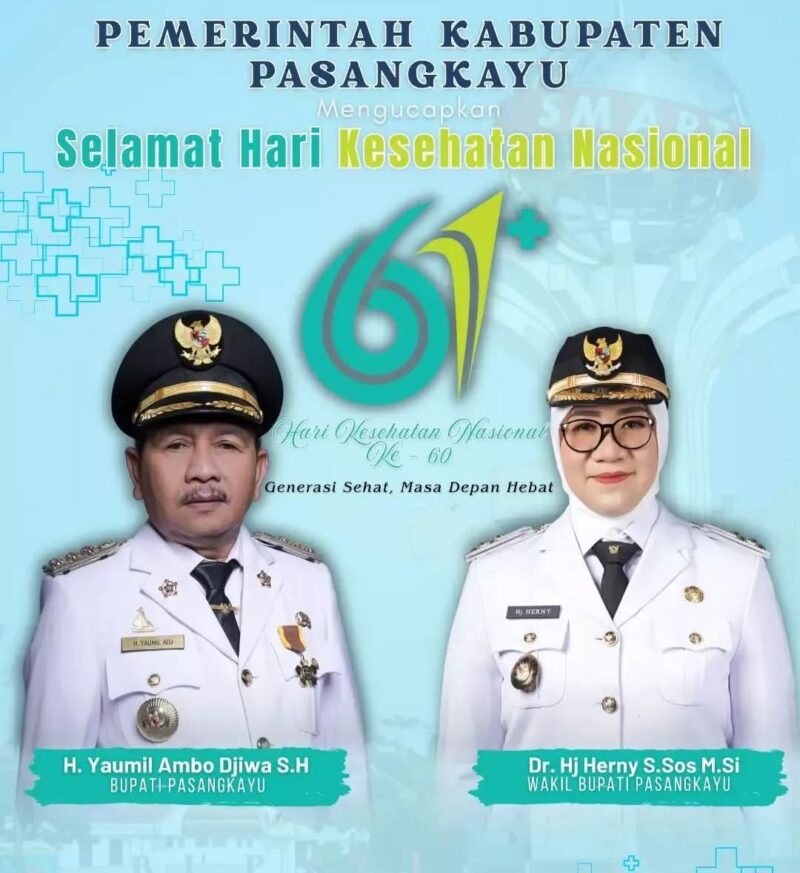 PASANGKAYU, CYBERMERAHPUTIH.CO.ID – Pemerintah Daerah Kabupaten Pasangkayu mengucapkan selamat memperingati Hari Kesehatan Nasional (HKN) ke-61 yang diperingati pada 12 November 2025. Tahun ini, peringatan HKN mengangkat tema “Generasi Sehat, Masa Depan Hebat”, sebagai seruan bersama untuk memperkuat kesadaran masyarakat akan pentingnya kesehatan sebagai dasar pembangunan sumber daya manusia yang unggul.