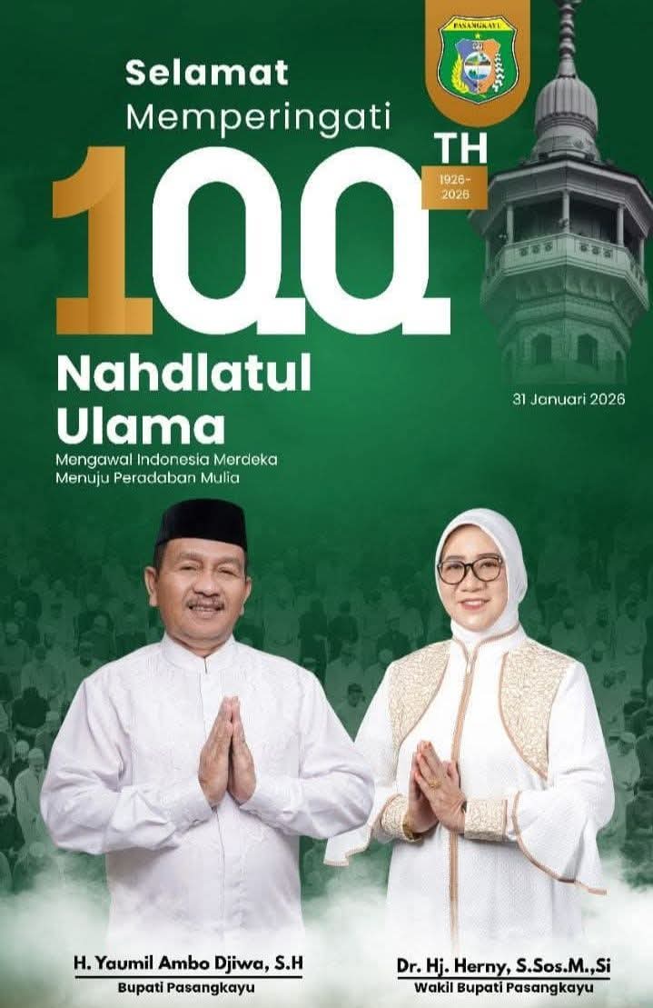 PASANGKAYU, CYBERMERAHPUTIH.CO.ID — Pemerintah Kabupaten Pasangkayu menyampaikan ucapan Selamat Hari Lahir (Harlah) ke-100 Nahdlatul Ulama (NU). Ucapan tersebut disampaikan sebagai bentuk apresiasi atas peran NU selama satu abad dalam berkhidmat kepada umat, bangsa, dan negara.