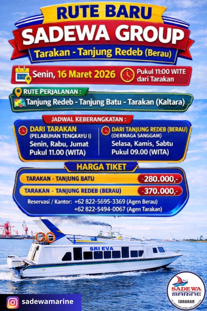 Tarakan, Cybermerahputih.co.id – Masyarakat yang hendak melakukan perjalanan laut dari Tarakan ke Berau maupun sebaliknya kini memiliki pilihan transportasi baru. Speed Boat Sadewa resmi membuka rute Tarakan Tanjung Batu Tanjung Redeb dengan jadwal keberangkatan perdana pada Selasa, 17 Maret 2026 pukul 09.00 WITA.