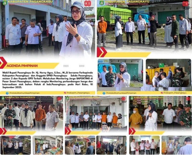 PASANGKAYU [CYBERMERAHPUTIH.CO.ID] – Wakil Bupati Pasangkayu, Dr. Hj. Herny Agus, S.Sos., M.Si., bersama jajaran Forum Koordinasi Pimpinan Daerah (Forkopimda), Anggota DPRD Pasangkayu, Sekretaris Daerah, Asisten II, serta sejumlah kepala Organisasi Perangkat Daerah (OPD) terkait melakukan monitoring harga dan ketersediaan bahan pokok penting (Bapokting) di Pasar Smart Pasangkayu, Rabu (10/9/2025).